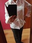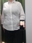 Блуза хорошего пошива и фасона. Белоснежная, я меряла на черный топ, поэтому на фото выглядит серой. Мне больше нравится и идет теплый белый оттенок. Мне маловата. И ткань тонкая, хлопок почти не ощущается.