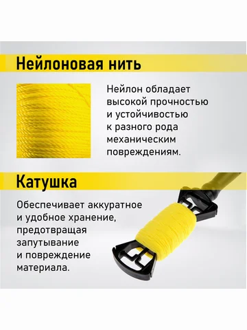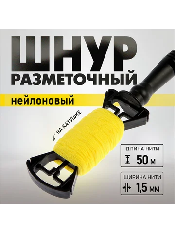 Шнур нейлоновый разметочный ТУНДРА, на катушке, 1.5 мм × 50 м. Профессиональная разметка на большом расстоянии! Нейлоновый шнур «Тундра» 1.5 мм в бобине 50 метров — это увеличенный запас прочного разметочного инструмента для масштабных работ. Шнур помогает быстро и точно отбивать прямые линии на грунте, бетоне и кирпичной кладке.