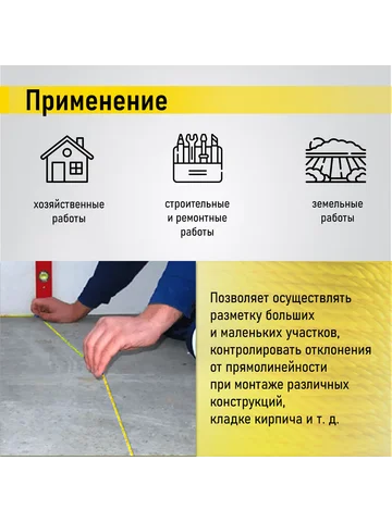 - Увеличенная длина — 50 метров: Такой длины хватает для разметки протяженных участков без переноса точек и лишних остановок. Это удобно для планировки фундаментов, дорожек или границ больших территорий.