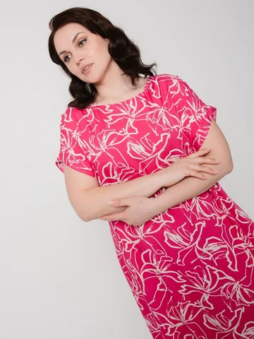Платье женское А-образного силуэта, из набивного штапеля, с карманами в боковом шве.Горловина круглая, рукав цельнокроенный, короткий, на притачной манжете.Ткань мультиколор, основной цвет - малиновый.