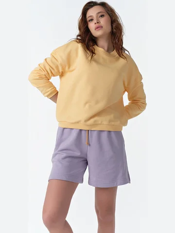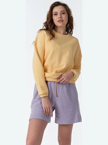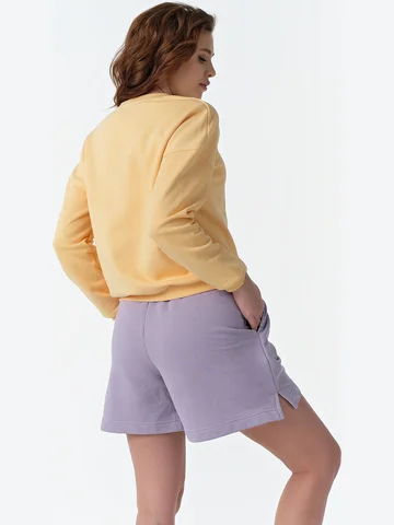 Особенности: Костюм из футера двух цветов. Детали свитшота: горловина обработана бейкой из кашкорсе в цвет спущенная линия плеча втачной рукав с манжетой из кашкорсе по низу притачной пояс из кашкорсе. Детали шорт: прямой силуэт притачной пояс с резиной и шнуром боковые карманы невысокие разрезы в боковых швах.