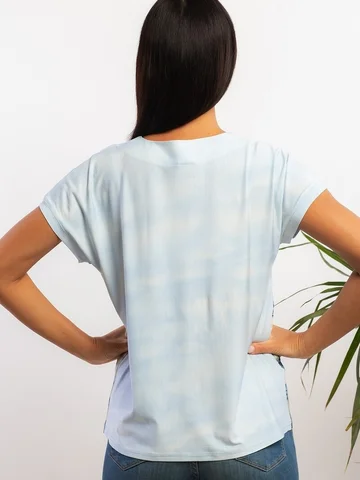 Летняя блуза свободного силуэта, линия плеча спущенная на манжете. Фигурный вырез горловины. Длина изделия 63 см. Обращаем внимание, что рост модели 180см. Ткань приятная, мягкая, легко драпируется. Красивая блуза от AhaLodensa для базового гардероба.