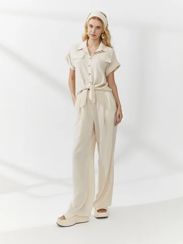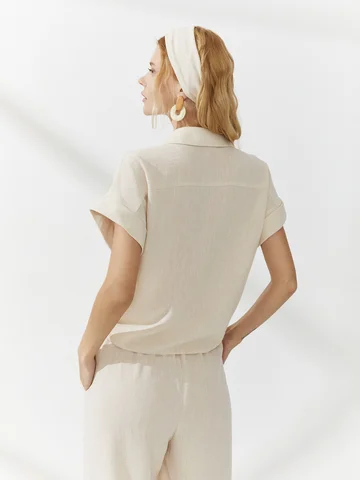 Блузка-рубашка прямого кроя имеет удлиненные полочки, которые можно завязать узлом, создавая акцент на талии. Модель с классическим рубашечным воротником на стойке и широкими манжетами на цельнокроеных рукавах сшили из кремового органического материала, пропускающего воздух. Единственным декором изделия стали клапана на груди и пуговицы природной палитры. На фото блузка представлена с брюками из такой же ткани Б-2013 УКМ(В4).