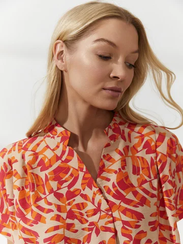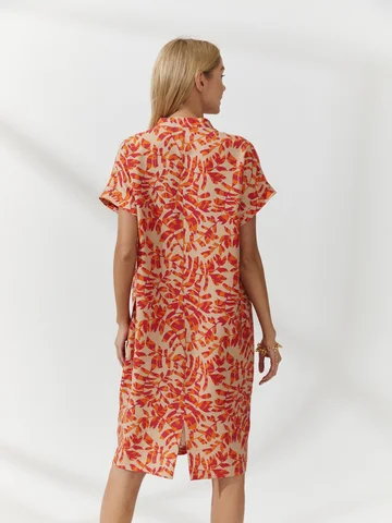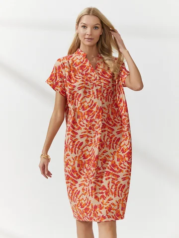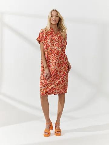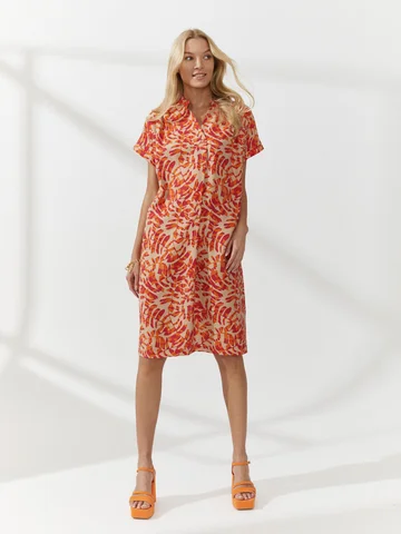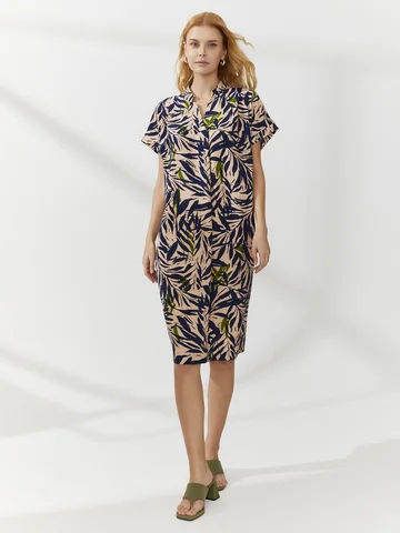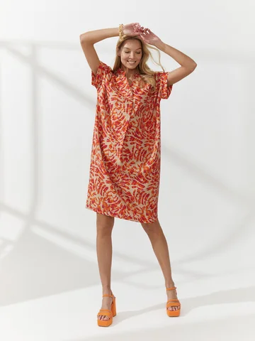 Платье-баллон с ярким паттерном сшили из тонкого материала, имитирующего лен с характерным деликатным меланжевым переплетением. V-образная горловина заканчивается мягкой вертикальной складкой над грудью, воротник-стойка, цельнокроеные короткие рукава на узких манжетах. Объемный крой поддержали мягкими складками от плеча. Длина до середины колена. Такая модель скрывает недостатки фигуры. Усмирить объем платья можно кожаным ремнем на талии (в комплект не входит) .