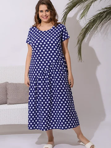 Из штапельной плательной ткани с набивным рисунком в горох, свободного покроя, удлиненное, с короткими втачными рукавами и горловиной овальной формы. Перед и спинка разрезаны по косой от правого бедра вниз. Нижние детали присборены по швам соединения с верхними. Состав: 100% вискоза. Ткань: штапель. Длина изделия: 125-126 см.