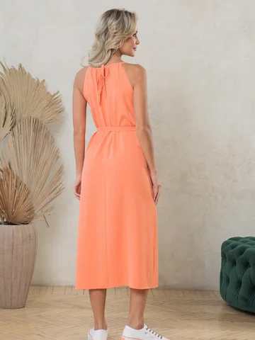 Комфортный сарафан свободного кроя. Выполнен из легкой костюмной ткани с эффектом жатки. Расцветка оранжевый. По переду внизу разрез. На завязке. Пояс в комплекте. Идеальный вариант на каждый день и на работу. Рекомендуемая стирка при t не более 30. ДИ в 42-44 р 111 см, в 46-48 р 112 см, в 50-54 р 115 см. Рост модели 168 см, размер изделия 44.