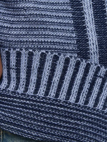 Можно брать на размер меньше. Вязка изделия выглядит ,как ручная , поэтому будет растягиваться. В жини изделие на много интереснее, чем на фото.Освежает сочетание цветов, синий с белым. Хороший джемпер.