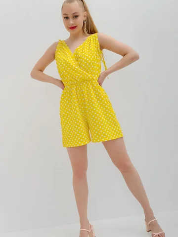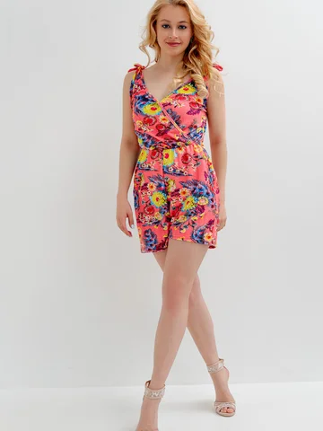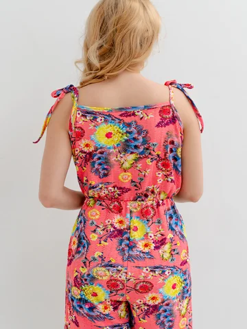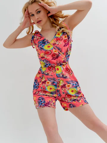 Яркий летний комбинезон. Этот короткий женский комбинезон с карманами станет отличным дополнением гардероба. Приятный жатый трикотаж с рисунком смотрится свежо и ярко. Бретели-завязки из той же ткани можно регулировать по длине. Можно сочетать как со спортивными кроссовками, и с босоножками на каблуках или танкетке.
