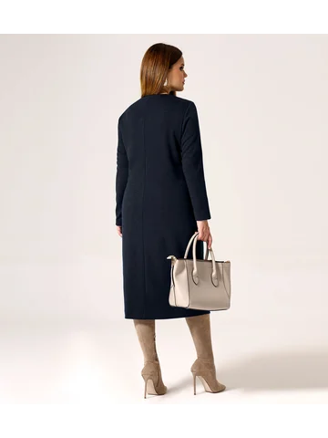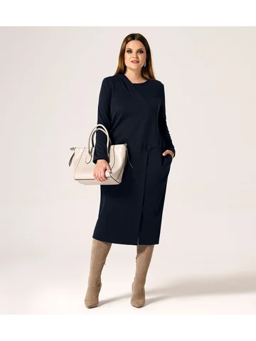 Мягкое и элегантное платье прилегающего силуэта выполнено из приятного на ощупь трикотажа.Рукав втачной ,длинный. Вырез горловины асимметричный,декорирован деталью со складкой,имитирующей воротник. На уровне ниже далии выполнен асимметричный подрез,декорированный пряжкой. Нижеподреза офирмлены складка,переходящая в шлицу снизу, и косой вход во внутренний карман. Длина платья ниже колена. Практичное и стильное платье на каждый день и для работы в прохладную погоду.