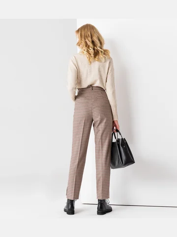 Классические брюки в боковых швах по переду карманы, застежка на тесьму-молнию, по линии низа в боковых швах оригинальные разрезы На задних частях брюк имитация кармана. Изделие застегивается на скрытую в гульфике молнию и пуговицу. Отрезной пояс имеет шлевки, в которые вы без труда проденете любимый ремень. Аккуратные линии кроя, в минималистичном стиле- и вы выглядите лаконично и стильно, брюки из поливискозной ткани . Стильные брюки в " деловом стиле"- шикарное решение для безупречных модных луков, можно одеть в самых разных ситуациях.актуальная модель сезона, которая поможет вам освежить деловые и повседневные образы. Они удачно комбинируются с однотонными водолазками, гольфами, свитерами, жакетами, жилетами, блузками. Брюки женские в клетку вы свободно наденете на работу, учебу, встречи с друзьями, походы в кино и развлекательные центры. Брюки женские, пошитые из поливискозного материала, не сминаются, не теряют форму и цвет. Вы можете купить брюки женские, которые отлично выглядят в сочетании с короткой курткой, длинным пальто или роскошной шубой.