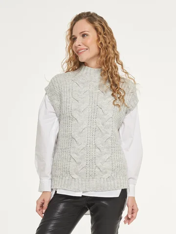 Жилет очень понравился. Вязка крупная, смотрится хорошо. Очень понравился цвет. При примерке - согревает. Понравился воротник-стойка. Длина на мой рост как на модели. Мне подходит даже без рубашки, как жилет на футболку с коротким рукавом. К покупке рекомендую.