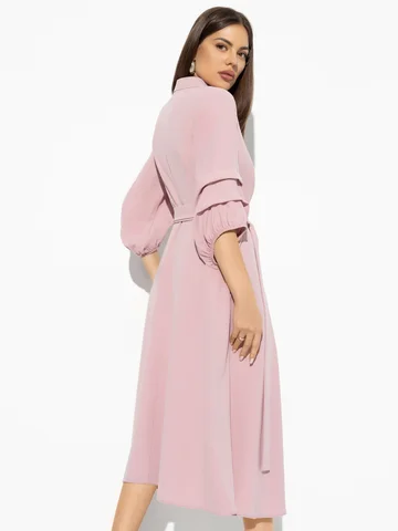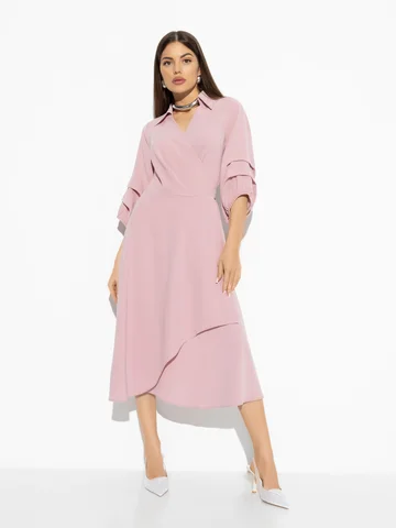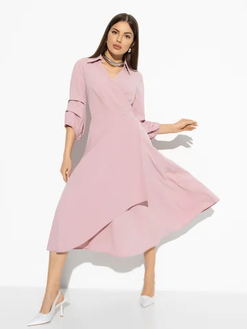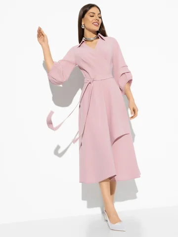 Цвет пыльной розы.Платье нарядное.С размером не прогадаете,оно будет облегать вас так,как вы затянете, идёт полностью запах,так что ошибиться сложно с размером.