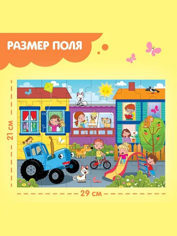 Макси-пазлы «Синий трактор», 30 деталей. Макси-пазлы «Синий трактор» — это занимательная развивающая игра для детей от 3 лет, которая не только стимулирует познавательную активность, а также помогает упорядочить мысли. Сюжет с участием любимого героя и забавных персонажей перенесет ребенка в мир приключений, где можно собирать яркую картину. Польза собирания пазлов для детей: