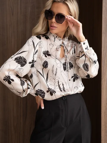 Блуза свободного силуэта из жатого- шифона. Втачной длиный рукав дополнен манжетой. Стойка горловины декорирована рюшей и завязками. Создайте нежный образ! Размерный ряд 44-56
