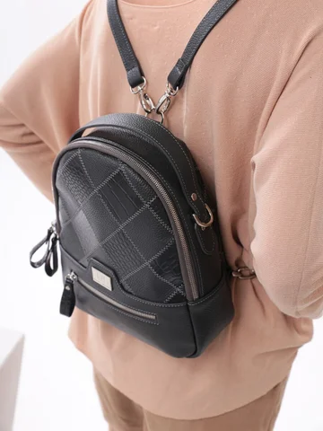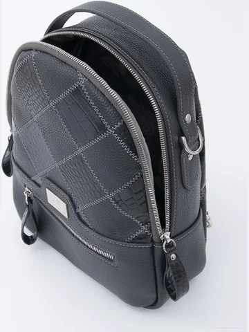 Рюкзак-сумка женский с одним отделением на молнии. Внутри потайной карман на молнии и открытый карман. Снаружи спереди карман на молнии и сзади карман на молнии. Имеет короткую ручку для переноски. Два съемных регулируемых ремня(89см) на карабинах позволяют носить изделие как рюкзак и как сумку через плечо.Материал: Натуральная кожа , Размер: 230x280x80