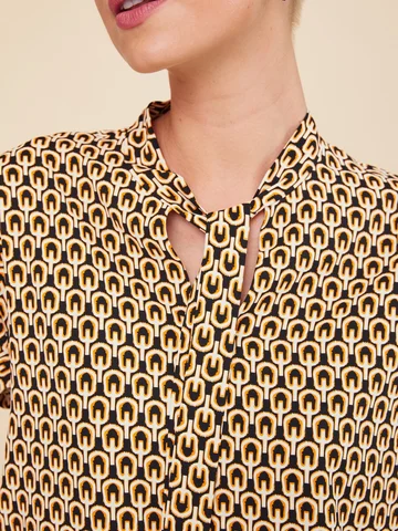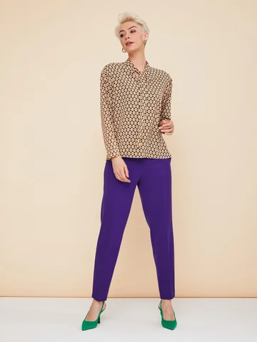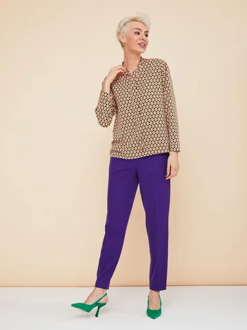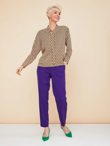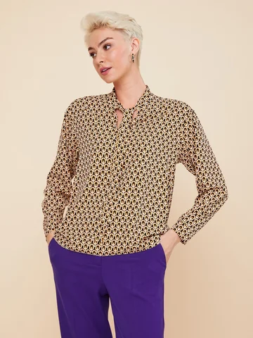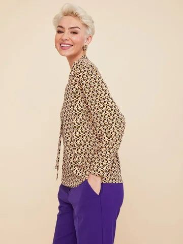 Блузка с воротником аскот гармонично сочетается с классическими вещами благодаря прямому крою с мягкой линией плеч и зауженными книзу длинными рукавами на манжетах. Для создания модели использовали мягкую немнущуюся ткань с разноцветным геометрическим принтом. Изделие без застежки, горловина с глубоким вырезом спереди завязывается бантом или галстуком. На фото блузка представлена с брюками Б-703 КОР(О2).