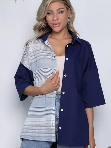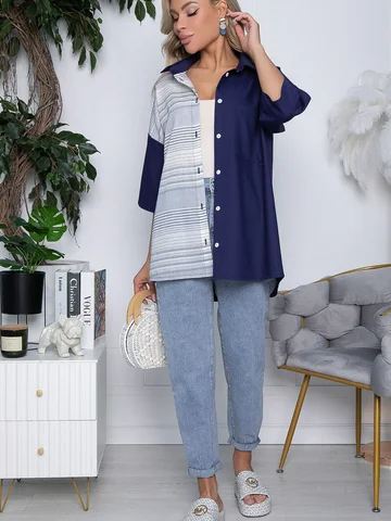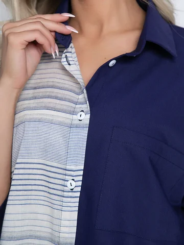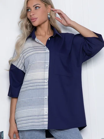 Рубашка классического кроя на пуговках свободного силуэта. Перед короче спинки, спинка удлиненная. Воротник классический на стойке. Закругленные бока, рукав втачной, спущенный удлинений. Один нагрудный карман. Без подкладки.