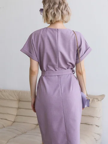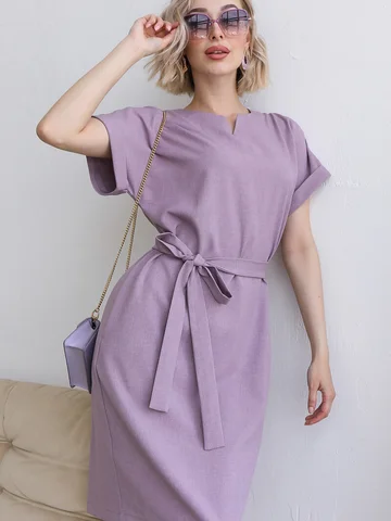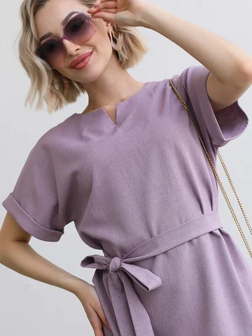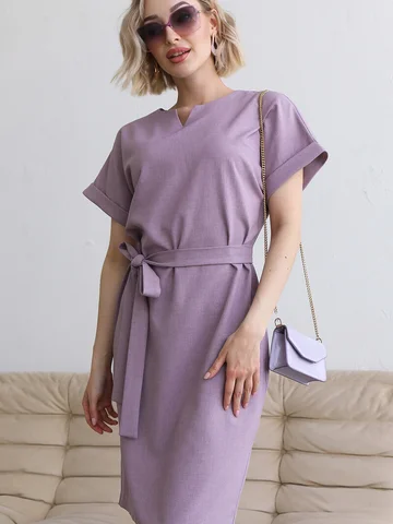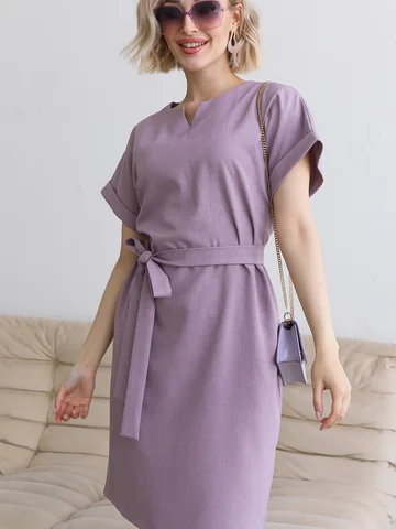 Удобное классическое повседневное платье из смесового льняного полотна с цельно выкроенными рукавами. Горловина переда оформлена фигурным вырезом. Рукава дополнены манжетами. В среднем шве спинки застежка на потайную молнию. В боковых швах удобные карманы. Пояс идет в комплекте из основной ткани.