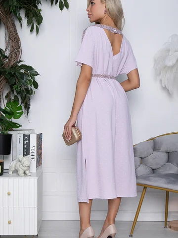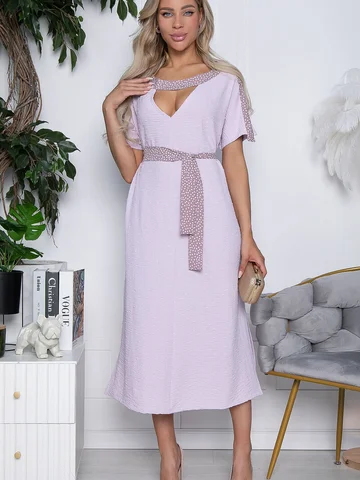 Элегантное платье прямого силуэта состоящее из 2-х видов ткани. Потрясающее платье несомненно подчеркнет Вашу женственность, а его интересный крой расставит грамотные акценты в вашем образе. Горловина округлая. Деликатный V-образный вырез на груди и спинке. Рукав спущенный. Пояс в комплекте. Платье без подклада.