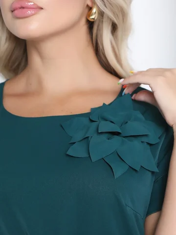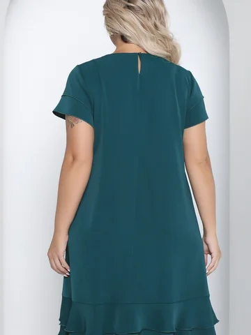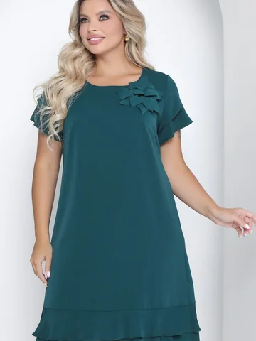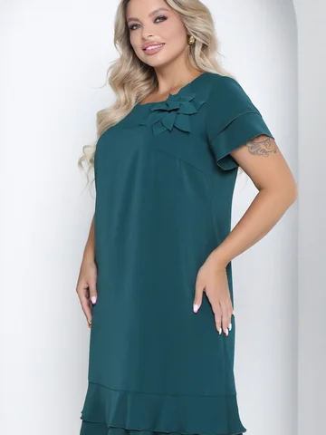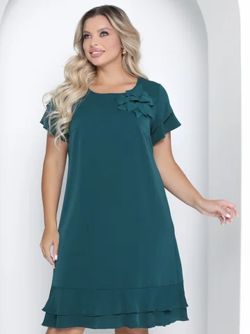 Платье А - силуэта с коротким двойным рукавом из плательной ткани. - круглый вырез горловины на внутренней обтачке - спинка со средним швом и застежкой на пуговицу - рукава втачные, короткие, двойные - низ ровный, с притачными воланами - без подклада - украшение - брошь входит в комплект.