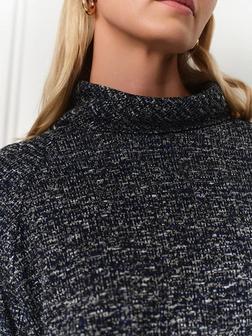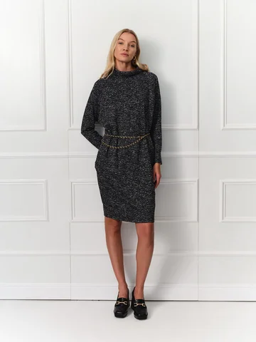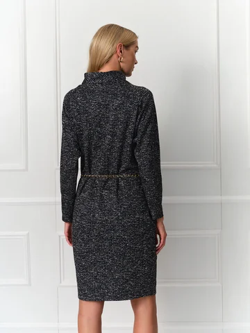 Графитовое платье силуэта кокон с длинными рукавами реглан окутывает мягким уютным теплом, но не препятствует циркуляции воздуха. Такой комфортной модель делает мягкий эластичный трикотаж с меланжевым узором. Воротник – хомут, карманы в боковых швах.