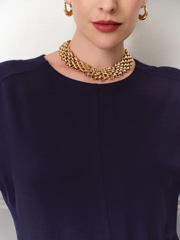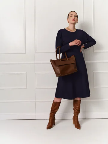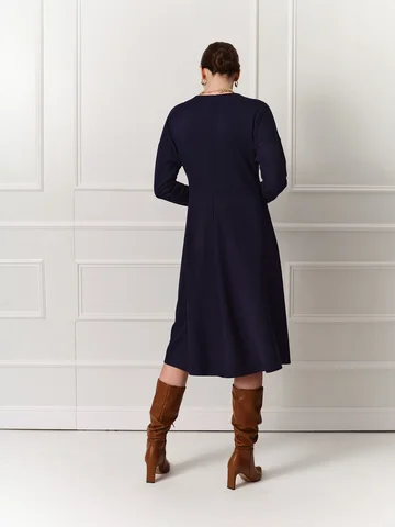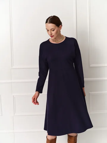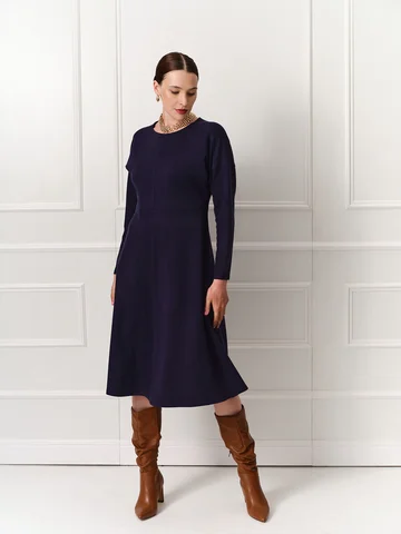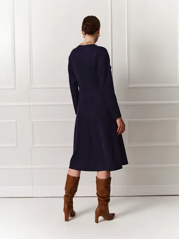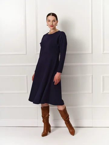 Темно-синее платье длины миди с расклешенной юбкой и низкой проймой выполнено из мягкого эластичного трикотажа, приятного к телу. Круглая горловина, длинный зауженный книзу рукав. Линия подреза спереди находится чуть выше талии и соединяется на спинке треугольником. Такой прием моделирует фигуру, а вертикальные швы по центру зрительно удлиняет силуэт. Комфортное и эффектное платье на каждый день.