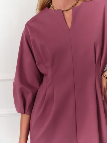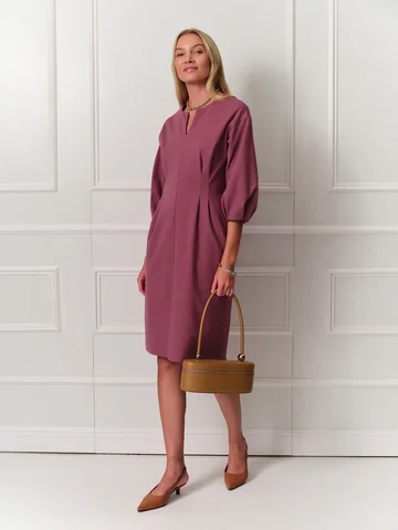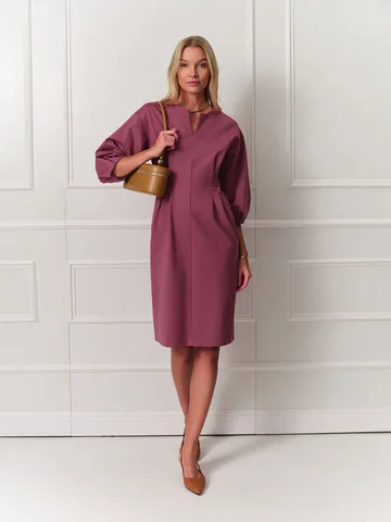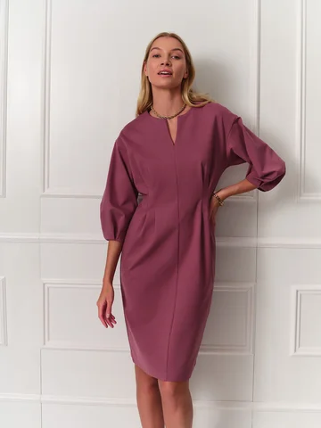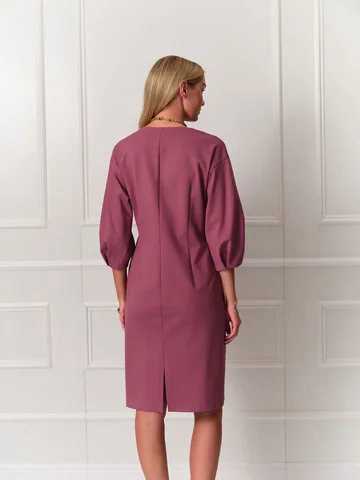 Лиловое платье длины миди выполнено из плотного эластичного джерси, поэтому идеально садится на любую фигуру и отлично держит форму. Горловина с вырезом галочкой, мягкая линия плеча, широкие рукава-фонарики длиной 3/4. Приталенный силуэт формируется вытачками на спинке и защипами спереди.