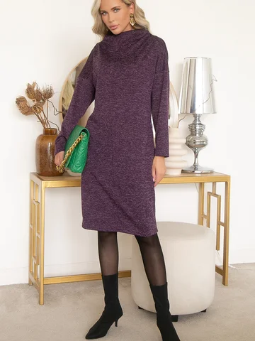 Трикотажное платье свободного силуэта со стойкой. Спереди расположен декоративный шов. Спущенное плечо, длинный рукав, в боковых швах есть карманы, платье без застежки.