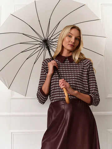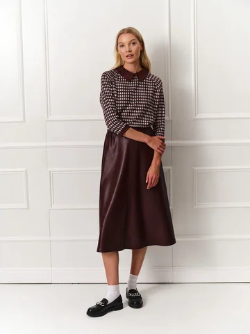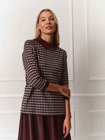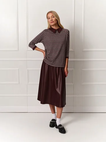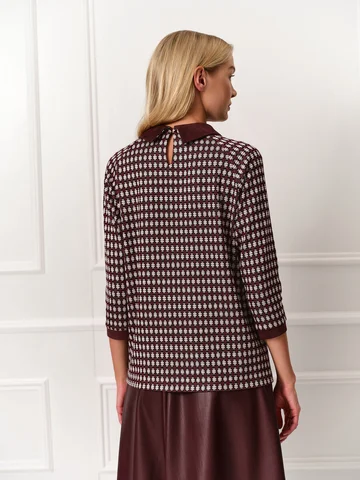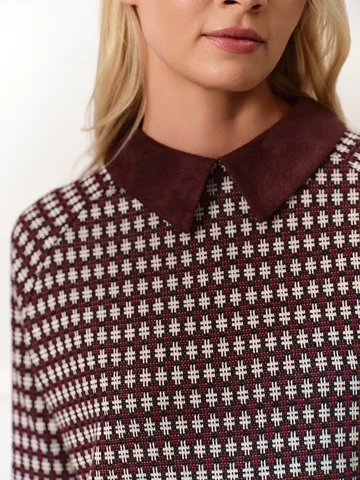 Джемпер прямого кроя с рукавами реглан длины 7/8 получился по-девичьи женственным. Для изготовления модели использовали мягкий уютный трикотаж бордового оттенка с мелким принтом. В качестве цветовой отделки выступают манжеты на рукавах и аккуратный воротник из искусственной замши винного оттенка. Застежка на пуговицу на спинке оформлена фигурной каплей. На фото джемпер представлен с юбкой из экокожи А-2022 УРГ(О4).