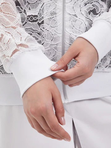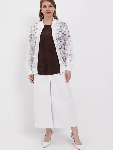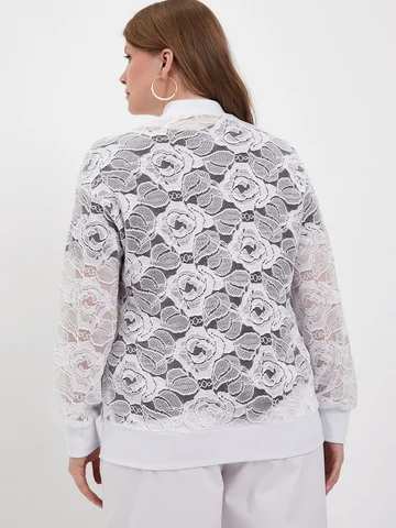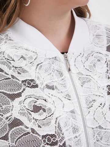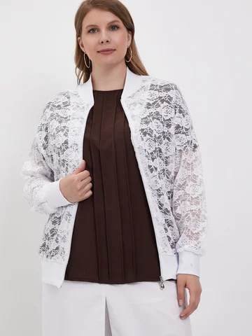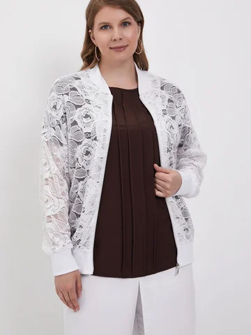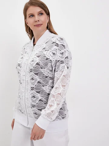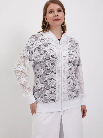 Легкий повседневнй бомбер больших размеров, выполнен из полотна по типу гипюра, на молнии с длинным рукавом, без подклада.