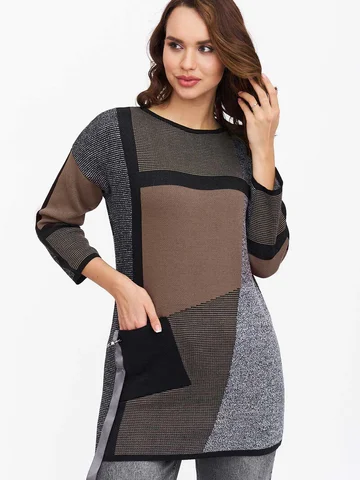 Удлиненный джемпер полуприлегающего силуэта с круглой горловиной, выполнен в оригинальном цветовом решении. Рукав 3/4. Полочка, спинка и рукава выполнена в жаккардовом переплетении с контрастным геометрическим рисунком. Накладной карман с декоративной тесьмой.