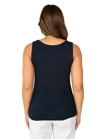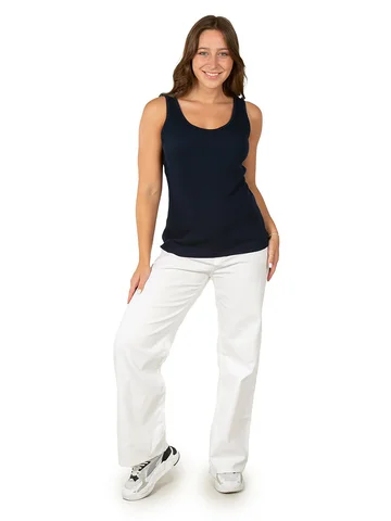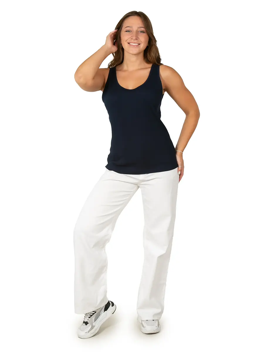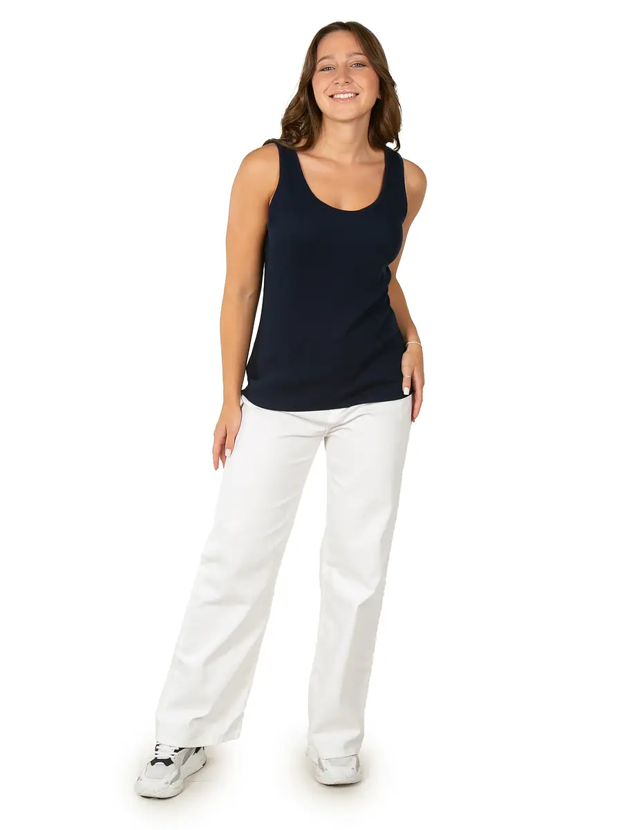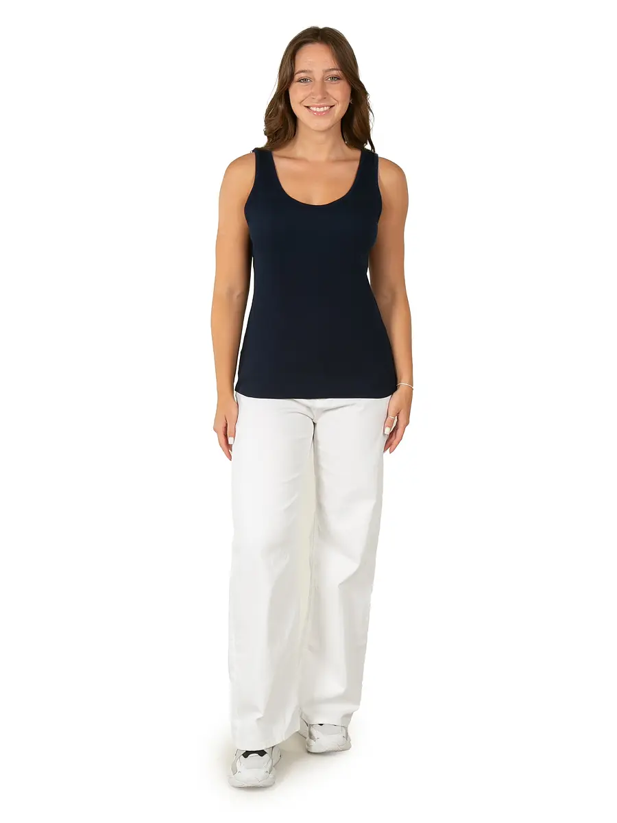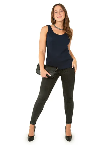 Майка женская под пиджак темно-синего цвета прекрасно впишется в повседневный гардероб. Стильная модель в обтяжку с широкими бретельками отлично комбинируется с любыми образами. Преимущественно хлопковая ткань с добавлением лайкры приятно облегает тело и позволяет коже дышать. Такой материал идеально подходит на каждый день и для офиса, и для дома.