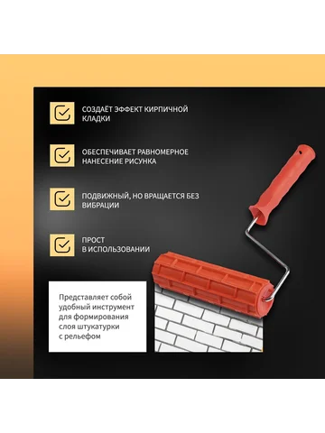 Валик декоративный ТУНДРА, резиновый, «кирпичи», рукоятка d=6 мм, 180 мм. Создайте эффект кирпичной стены за несколько движений! Резиновый валик «Кирпичи» 180 мм — специальный инструмент для декоративной отделки. Формирует реалистичный рисунок кирпичной кладки на штукатурках и структурных красках.
