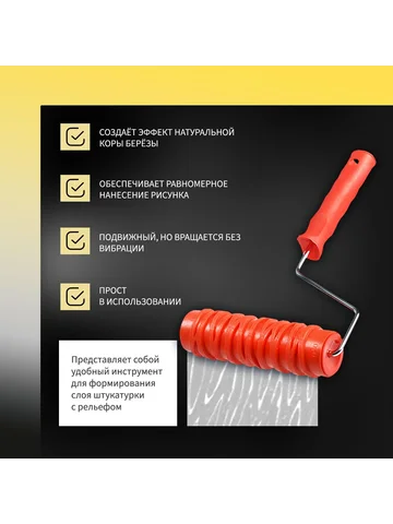 Валик декоративный ТУНДРА, резиновый, «кора березы», рукоятка d=6 мм, 180 мм. Создайте естественную текстуру дерева на стенах! Резиновый валик «Кора березы» 180 мм — профессиональный инструмент для создания реалистичного древесного рельефа. Формирует природный узор коры на декоративных штукатурках и структурных красках.