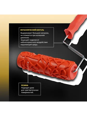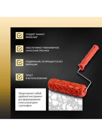 Валик декоративный ТУНДРА, резиновый, «кракелюр», рукоятка d=6 мм, 180 мм. Эффект старины за несколько движений! Резиновый валик «Кракелюр» 180 мм — специальный инструмент для создания эффекта потрескавшейся поверхности. Формирует декоративные трещины на штукатурках и структурных красках.