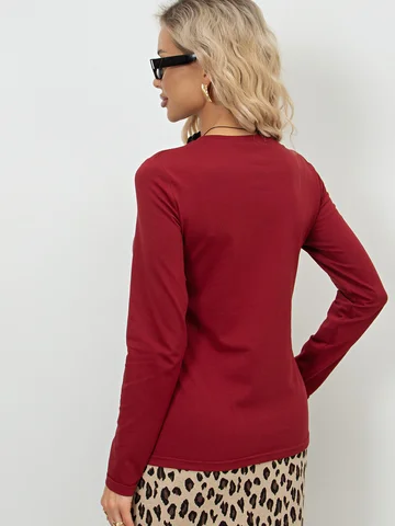 Лонгслив полуприлегающего силуэта из однотонного трикотажного полотна. Округлый вырез горловины на внешней обтачке. Длинные втачные рукава. Низ ровный, без разрезов. Идеальный вариант на каждый день.