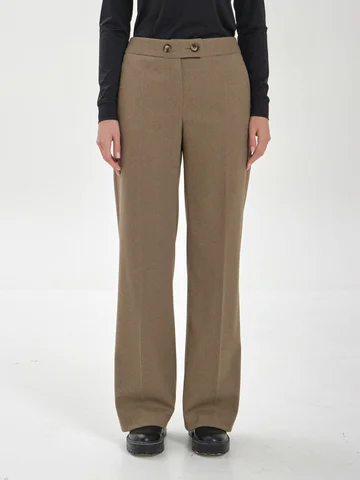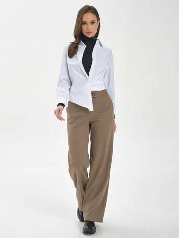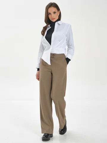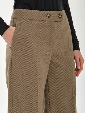 Спереди карманы в подрезных бочках и застежка на молнию и пуговицы на поясе.