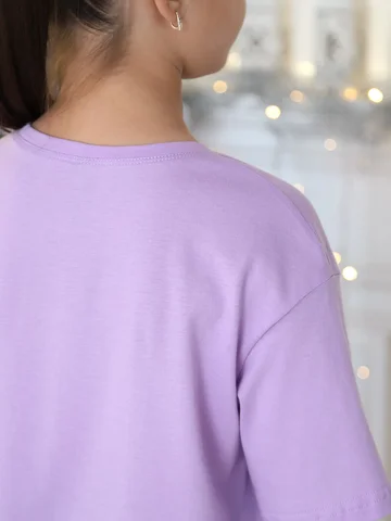 Костюм для девочки из трикотажного полотна "кулирка", состоящий из футболки и брюк. Футболка - из гладкокрашеного полотна, модного слегка расширенного силуэта и укороченная по длине, с втачными короткими рукавами, горловиной овальной формы, обработанной втачной планкой и принтом на полочке, выполненным методом шелкографии. Брюки - из полотна в клетку, широкие, прямые, на притачном поясе с эластичной тесьмой внутри и карманами в боковых швах .