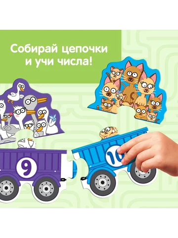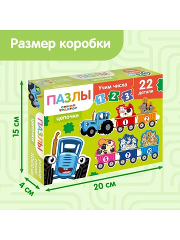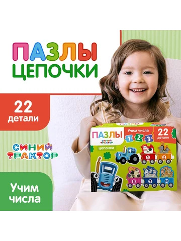 Пазлы - цепочки «Синий трактор: Учим числа», 22 детали. Пазлы-цепочки серии «Синий трактор» предоставляют детям возможность погрузиться в увлекательный мир изучения чисел. Этот настольный пазл, состоящий из 22 деталей, создан специально для детей от 3 лет. Универсальная игровая концепция и понятный формат помогут раскрыть потенциал вашего ребенка в игровой форме. Главные особенности