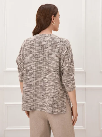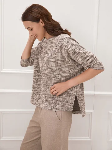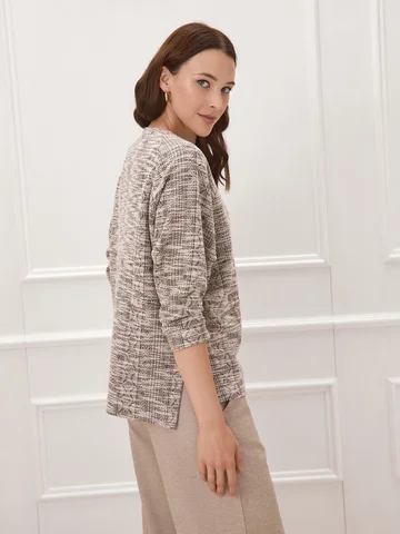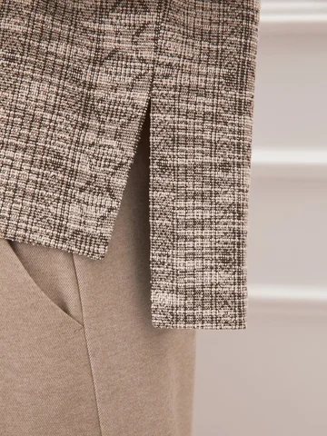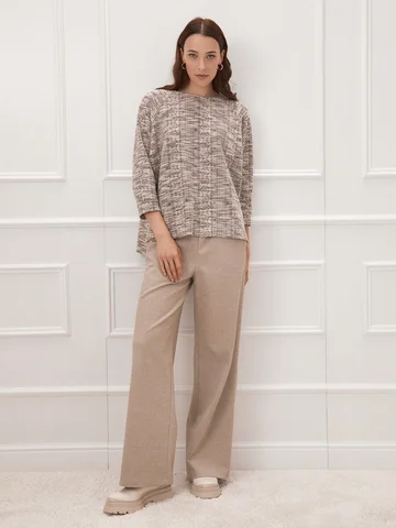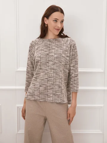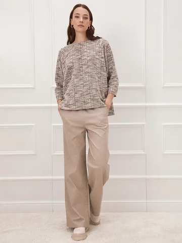 Бежево-коричневый джемпер с овальной горловиной и рукавами реглан длины 3/4 имеет свободный силуэт. Чуть удлиненная спинка и боковые разрезы придают изделию непринужденность и легкость. Модель выполнена из мягкого буклированного трикотажа с размытым полосатым принтом «арабеска». На фото джемпер представлен с брюками Б-900 РИЯ(О4).