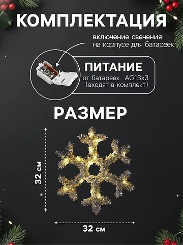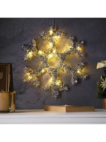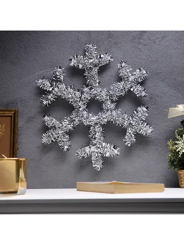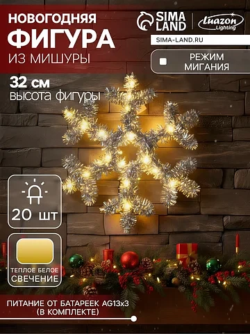 Светодиодная фигура из мишуры «Снежинка серебристая» 32×2 см, 20 LED, батарейки AG10×3 (в комплекте), свечение теплое белое.