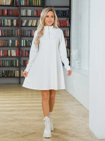 Комфортное платье А-силуэта. Выполнено из трикотажного полотна. Воротник стойка. По переду заложена застежка на молнию. Длинный втачной рукав 62 см. Низ ровный, без разрезов. Модель станет прекрасным дополнением к Вашему гардеробу. Без подклада. Без застежки. ДИ в 42-44 р 88 см, в 46-48 р 92 см, в 50-54 р 95 см.