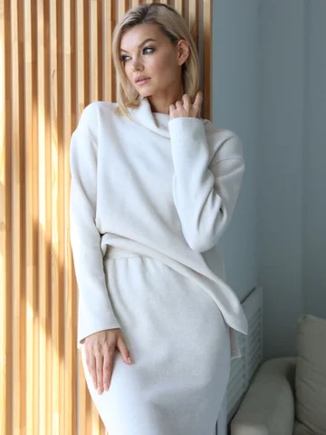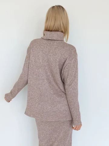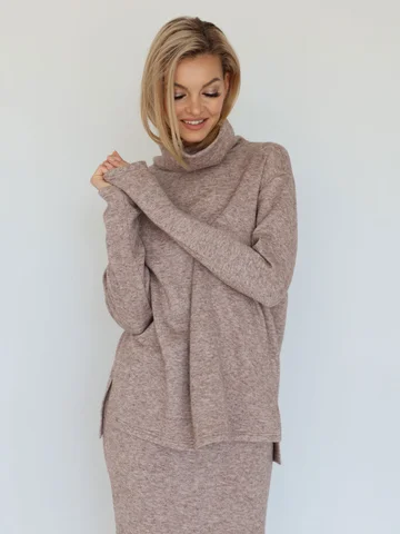 Свитер из евроангоры свободного кроя с горловиной-хомут, спущенная линия плеча, спинка изделия длиннее переда, разрезы в боковых швах