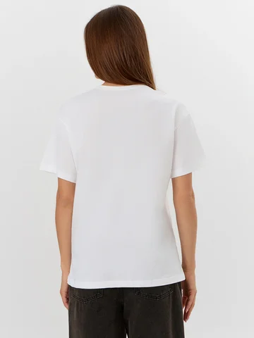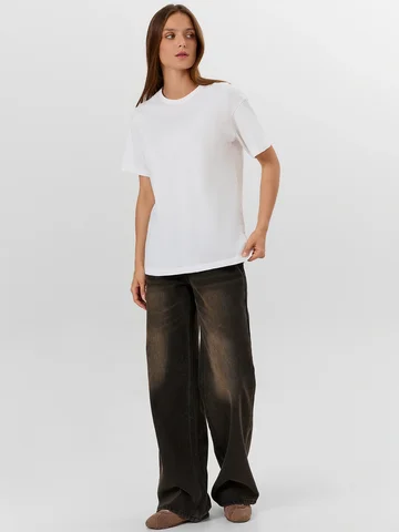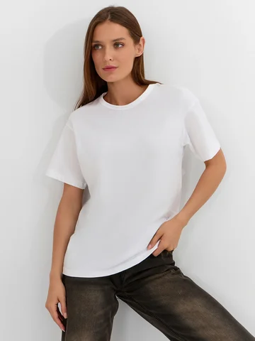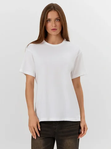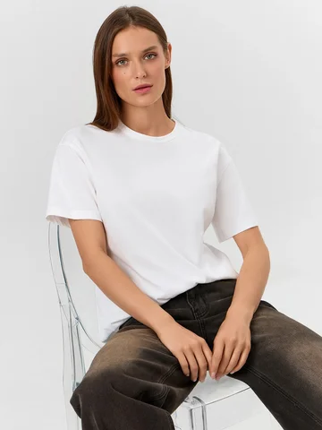 Эта женская футболка — универсальный и стильный элемент гардероба, который легко интегрируется в любые повседневные образы. Прямой и свободный крой обеспечивает комфортную посадку, позволяя двигаться свободно и непринужденно. Круглая форма горловины и короткие рукава добавляют классический и лаконичный акцент, делая модель подходящей для различных случаев — от прогулок до офисных будней. Изделие выполнено из хлопковой кулирки — натурального, мягкого и воздухопроницаемого материала, который дарит коже приятные ощущения и сохраняет свежесть в течение дня. Футболка прекрасно сочетается с джинсами, брюками, юбками и шортами, позволяя создавать как расслабленные, так и более элегантные комплекты. Практичная, удобная и стильная — прекрасный вариант на каждый день!