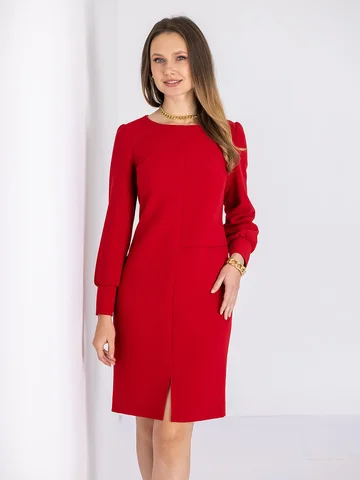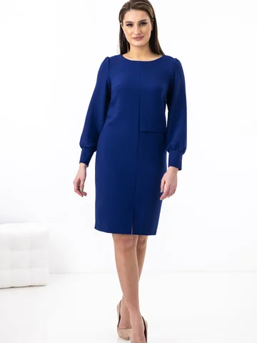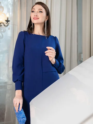 Платье полуприлегающего силуэта с небольшим разрезом по центру полочки. Круглый вырез. Длинный рукав на широкой манжете с пуговицами. Ниже линии талии ассиметричная горизонтальная планка. По спинке потайная молния.