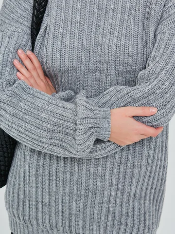 - Горловина: круглый вырез с невысоким свитерным воротником, который акцентирует внимание на шее.