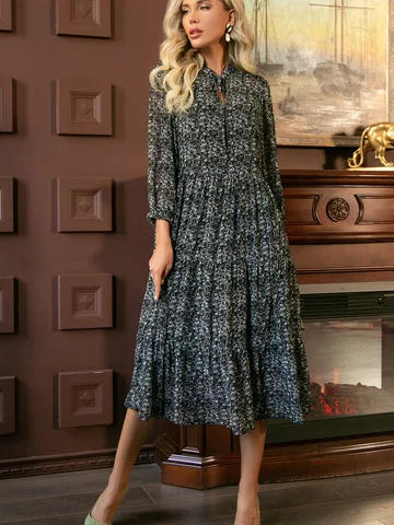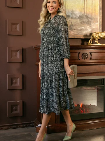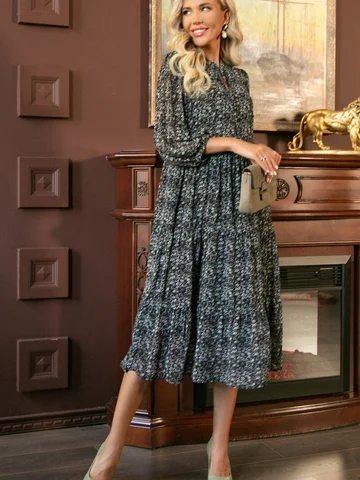 Платье свободного силуэта из шифона. Модель с завышенной линией талии. Юбка состоит из трех ярусов на сборке. Округлая горловина-стойка отделана узкой бейкой, переходящей в завязки, по переду разрез - капелька. Рукав втачной 3/4 длиной, низ на манжете . Низ ровный, без разрезов. Легкое и воздушное платье подойдет для прогулок и приятных встреч. платье без застежки. Платье на подкладе.