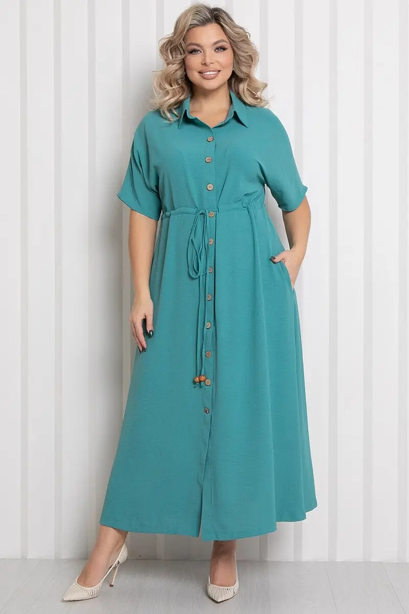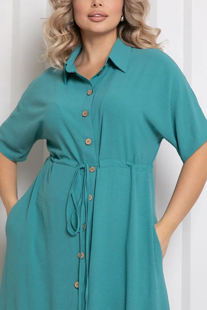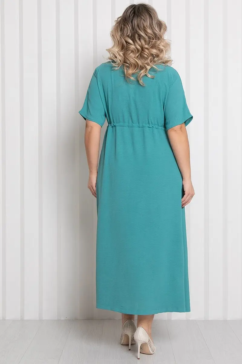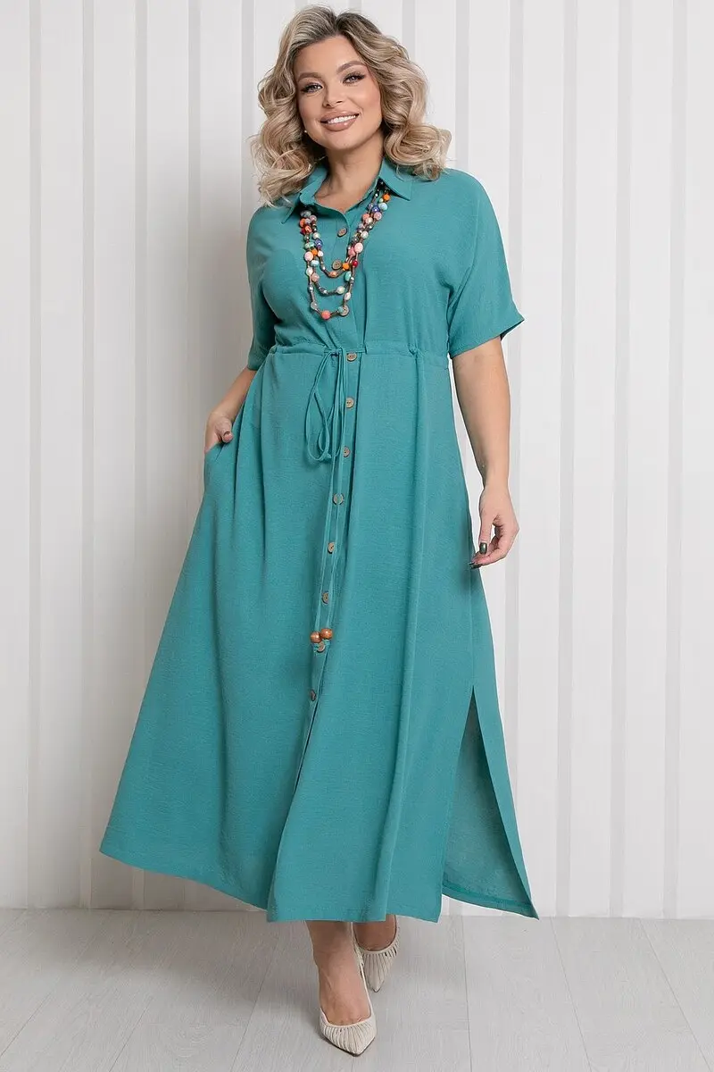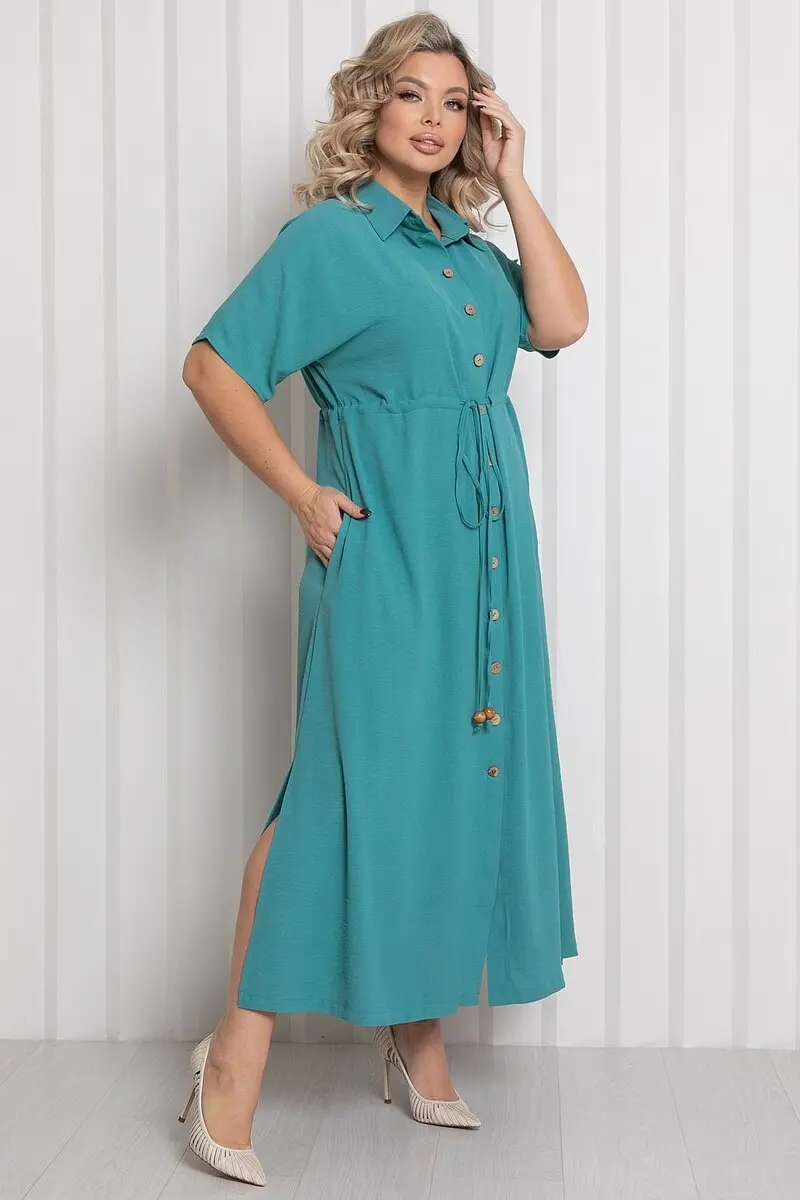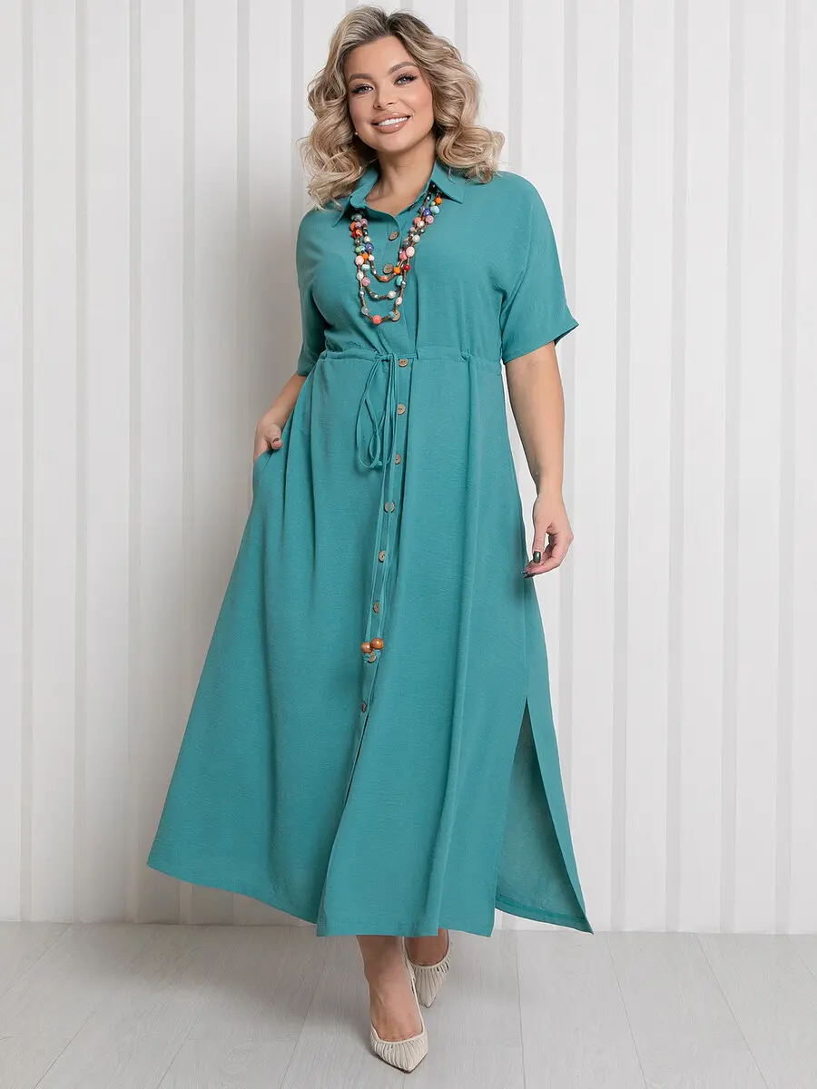 Платье полуприлегающего силуэта однотонной расцветки. - горловина с отложным воротником на стойке - застежка по центру переда на пуговицы - рукава цельнокроеные, короткие - слегка завышенная отрезная линия талии подчеркивается кулиской с завязками - в боковых швах прорезные карманы - низ ровный, с разрезами по бокам - длина макси - без подклада.