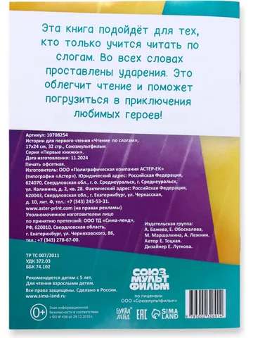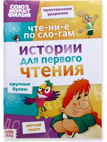 Книга детская «Истории для первого чтения. Читаем по слогам», 17×24 см, 32 стр., Союзмультфильм. Книга «Истории для первого чтения. Читаем по слогам» — это идеальный помощник для малышей, которые только начинают знакомиться с миром чтения. Вместе с любимыми героями Союзмультфильма ребенок легко освоит слоговое чтение, а яркие иллюстрации и увлекательные рассказы сделают процесс обучения веселым и интересным. Особенности