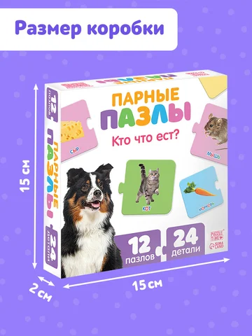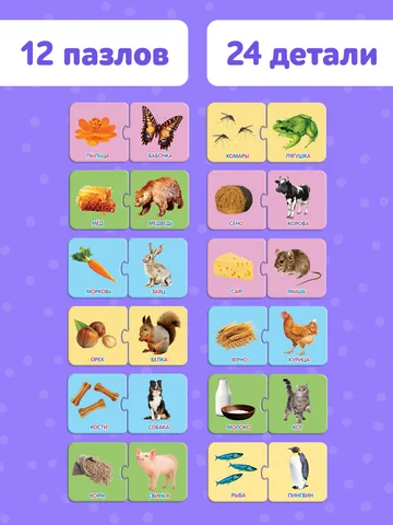 - Парные пазлы с яркими иллюстрациями животных и их пищи.